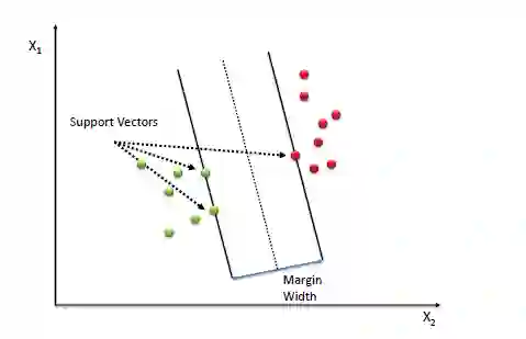 这两个类数据可以用直线(线性分离)轻松分离。左图显示了2个可能的线性分类器的决策边界。SVM模型其实就是关于生成正确的分界线(在较高维度称为Hyperplane)。在左图中,我们可以看到数据分类非常好,尽管红线对数据进行了分类,但在新的数据实例中可能无法很好地执行。我们可以画出许多对这些数据进行分类的线,但是在所有这些线中,蓝线可以分隔最多的数据。如果将相同的蓝线显示在右图,这条线(超平面)不仅分离了两个类,而且还保持了最远的相近的训练实例的距离。我们称之为大间距分类器(Large Margin Classification)。