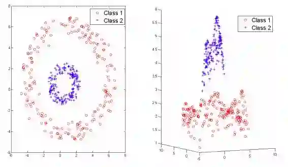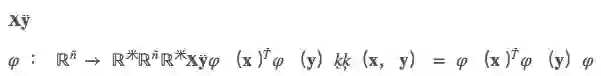 内核是计算两个向量X,Y的点积的一种方法和在某些(可能非常高的维度)特征空间中,这就是为什么内核函数有时被称为“广义点积分”。假设我们有一个映射:φ:Rn→Rm,这使我们的矢量在Rn到某些特征空间Rm。然后数量积X,Y在这个空间里面是 φ(x)Tφ(y)。一个内核是一个函数K相当于数量积:k(x,y)=φ(x)Tφ(y)。内核提供了一种方法来计算某些特征空间中的点积,甚至不知道这个空间是什么。