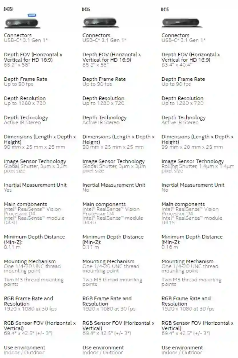 截至2019/08/07,英特尔Realsense系列产品包含: (1) Realsens200系列相机:F200和R200; (2)Realsense300系列相机: SR300和ZR300;(3)视觉处理器D4系列(硬件): D4和D4M; (4) RealsenseD400系列模块(硬件): D400,D410,D415,D420和D430; (5)最新发布的相机: D415 (D4视觉处理器和D415模块), D435(D4视觉处理器和D430模块)和D435i(D435+IMU)。
