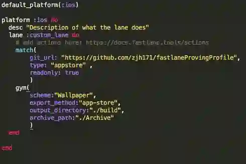 中scheme:"Wallpaper",的含义。其他的参数也就不一一赘述了。读到这里,相信大部分读者已经对fastlane的原理一清二楚了。其实所谓的会用fastlane也就是会用里面的各种工具而已。我相信大家选完Scheme后还没到打包这一步,应该已经出现了错误提示,错误应该就是大家都非常熟悉的证书问题;当然,如果读者够侥幸,证书已经设置好了,并将output_directory、archive_path设置好了,那就能生成对应的对应的IPA包。但相信成功的读者应该寥寥无几,这个时候就要使出我们的大杀器match