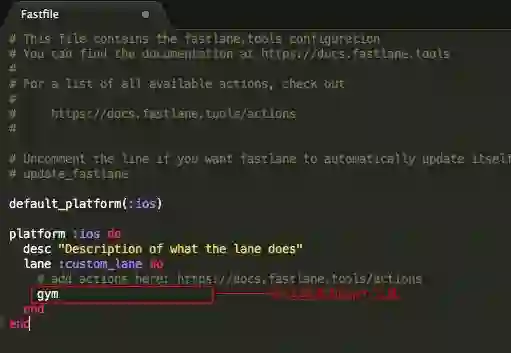 提交审核的前一步是打包,也是最主要的一步fastlane中有专门用于编译、打包的命令gym,我们加到lane :custom_lane do后看看会不会有问题。