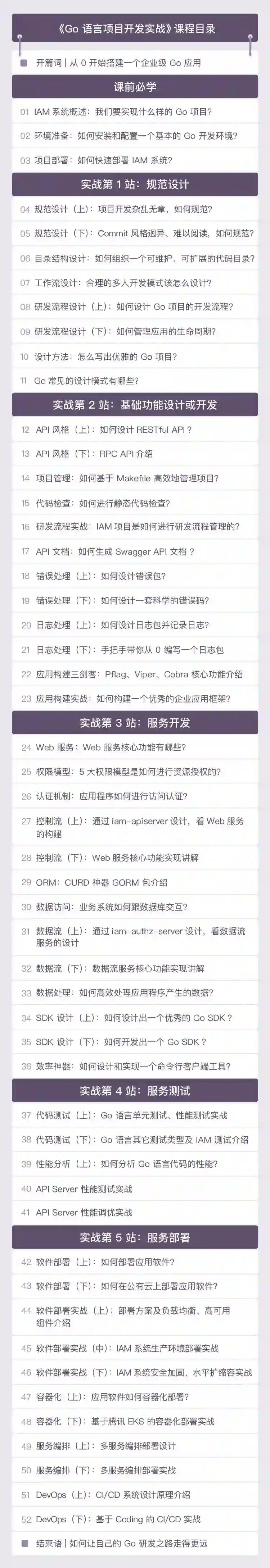 实战第 3 站:服务开发,带你解析一个企业级的 Go 项目代码,进而学会如何开发 Go 应用。同时,详细讲解 Go 开发阶段的各个技能点,例如如何设计和开发 API 服务、Go SDK、客户端工具、错误码、日志包等。