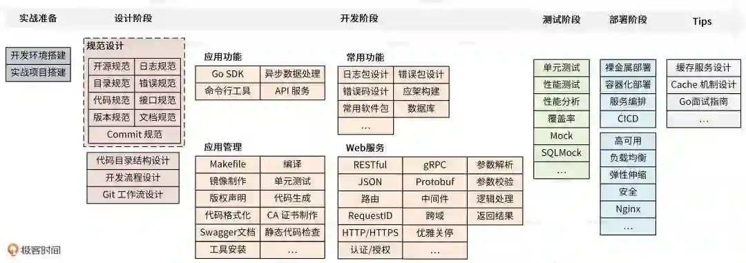 具体怎么做呢?先看一张图谱,涵盖了 Go 项目开发中大部分技能点,内容是按开发顺序排列的,如果这些技能点你都能掌握,上面的那些就不成问题了:
