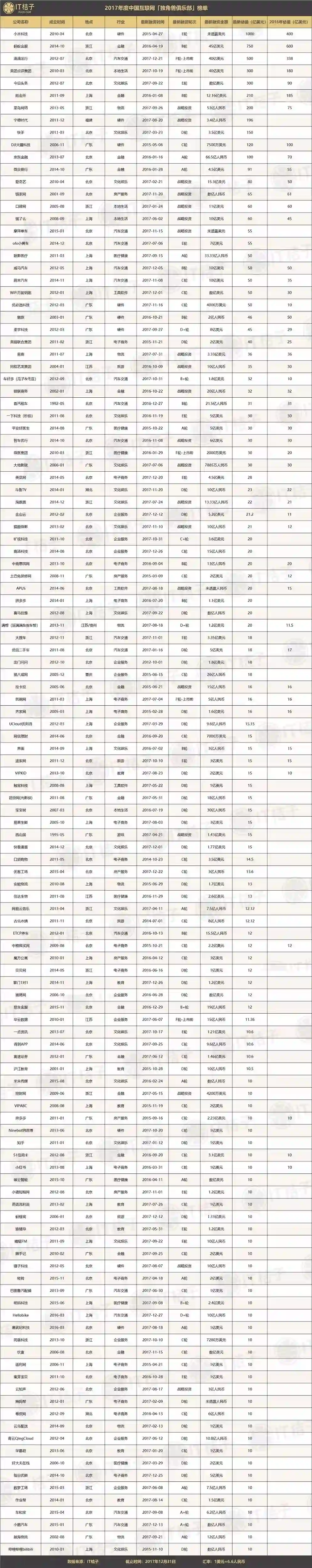 (注:2018 年伊始,就有「自如」和「曹操专车」等公司拿到大额融资,晋级到独角兽俱乐部,我们将放在下一年的独角兽榜单中)