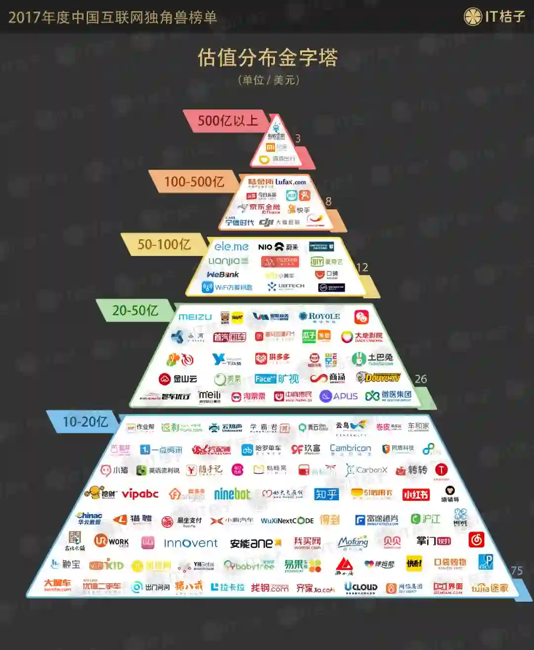 从《IT 桔子 2017 年度中国互联网「独角兽俱乐部」榜单》估值区间来看,我们将其细分为 5 个阶段,做出了如上的估值分布金字塔。