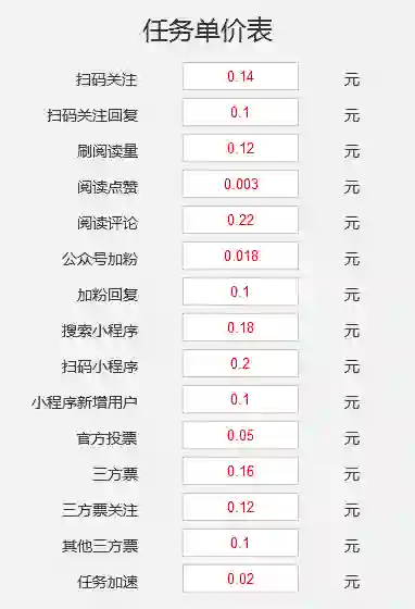 图:平台上各类刷量任务的单价不同,扫码小程序最高,阅读点赞最低
