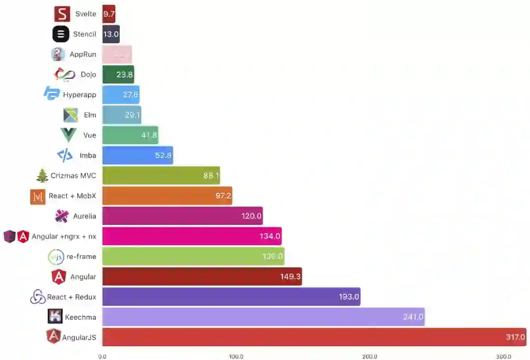 在性能最好的 13 个框架中,有 6 个(Svelte、Stencil、AppRun、Dojo、HyperApp 和 Elm)的传输大小小于 30KB,Vue为41.8K,排第7位: