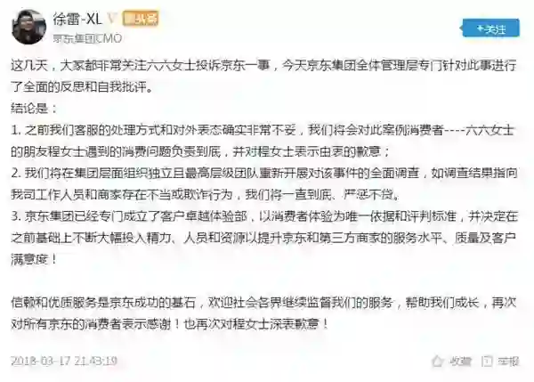 令人意外的是,3月17日,京东集团CMO徐雷回应称,对六六的朋友程女士表示歉意,并将对此事件进行全面调查。