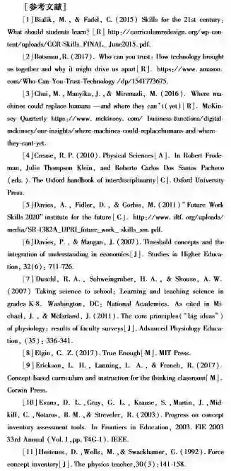 1)林恩•埃里克森和洛伊斯•兰宁(Lynn Erickson and Lois Lanning)基于概念的课程(concept-based curriculum)研究(Erickson et al.,2017),确定了跨学科的宏观概念,如“变化”“互相依存”和“关系”等,也确定了具体学科的微观概念,如“有机体”“文明”和“数字”等。这些概念是课程的基础,然后通过特定主题的具体事实、技能[与CCR的定义(Bialik & Fadel,2015)不同)]和策略探索这些概念。其中,技能和策略组成了过程,原理和概括展示了概念之间的关系。