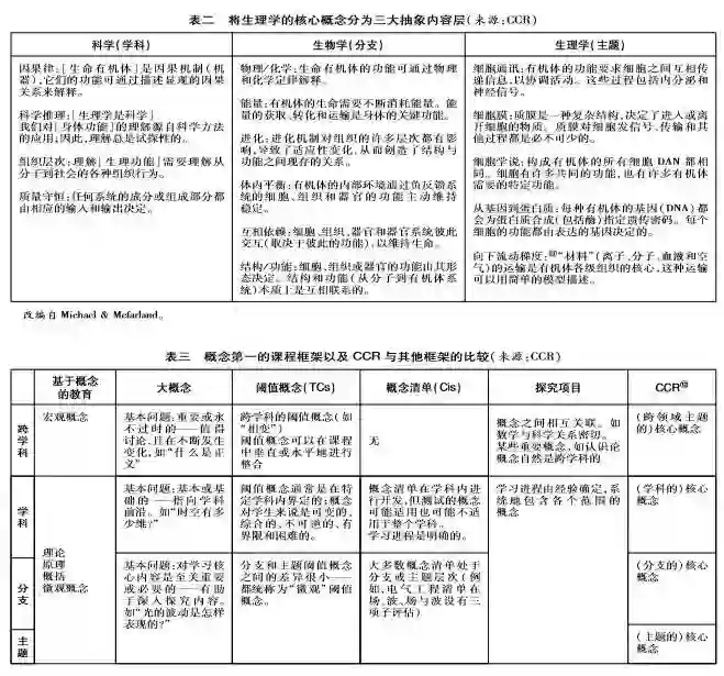 根据层次组织核心概念,每个话题的概念数量就变得可控了,因为高层次概念适用于所有低层次情境。在上述例子中,由于主题是“生理学”,就不需要在“科学推理”和“向下流动梯度”之间做选择,因为这是根据范围组织的。其他概念中心的分类框架都只是部分地基于概念分类学划分了概念。表三将CCR框架与类似的概念中心框架作了比较。