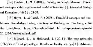 3)阈值概念(Threshold Concepts,简称TCs)。专家(通常是默会的)认为,这些概念是掌握学科的核心,学生学习时会发现这些概念是反直觉的,不过一旦学会了就会发生转变。该术语的提出者迈耶和兰德(Meyer & Land,2003)认为: