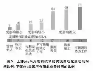 1995-2015年就业市场份额的百分比变化:在所有国家中,中等技能工作的数量平均减少了10%,高技能工作(深蓝)约增加8%,低技能工作平均增加约2%(来源:OECD)。特别是,可预测的体力工作、数据加工和数据搜集的任务最有可能实现自动化,而这类任务占美国所有工作的50%(见图5)(Chui et al.,2016)。最不易实现自动化的是那些需要专长、与他人互动,尤其是需要管理能力的任务。显而易见,因为算法将取代最机械的任务,人们需要管理计算机,就像管理由人类执行的任务那样。