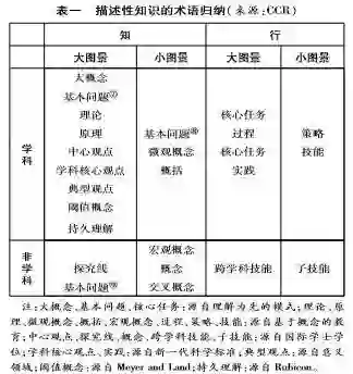 以上这些框架通过把概念放在首位,对内容采用“少即是多”的组织方式,它们并不增添课程中需要包含的方方面面,而是对内容加以合并,将其高效地组织起来,发挥迁移作用。⑥为促进迁移,学习者知与行之间必须达成平衡。极端的“行”会产生处方性知识,学生知道如何做事,但他们不会利用深层的理解,只记得完成目标所必须的表层行动。因此,许多框架都明确要求知行合一,以掌握知识的核心。类似地,超越某学科进行思考,需要将知识迁移到新的情境中,这一点在知识框架中常被提及。表一归纳了在知一行和学科一非学科的两分法下,各知识框架之间的关系。