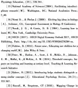 如何在学科内和跨学科组织概念呢?具有开创性的“力的概念清单”提到一种“分类学”,它将条目分门别类,包括“运动学”“动力”“一对作用力/反作用力”等(Hestenes et al.,1992)。其他概念清单提到了“概念群”(Steif,2004)、运用“分测验”(Evans et al.,2003)“宏观和微观层面”(Kinchin,2010)概念,或是探讨诸如“成熟”(Peter et al.,2014)等跨学科概念。许多框架也提到了概念之间的相互联系。准确的概念化取决于框架涉及范围(sale)的方式,不过普遍共识是,概念是相互关联的,因此,理解是彼此影响的。