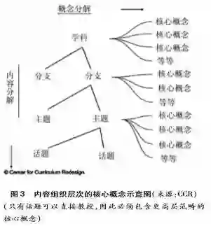 我们提出这样一种架构:1)分解内容和概念;2)鉴别每个内容组织层次上的少量核心概念(有许多跨学科的联系)。话题处于最小的单位水平,包括内容本身;它们可以直接教授,并应当用于例证、示例和更高层次的核心概念。这种方法的优点之一,是特定的内容(如细胞的部分)可以继承更高层次的核心概念(如科学推理),甚至继承其他学科的概念(如劳动分工)。这一组织方式帮助课程设计者时刻把握学习目标与教学内容之间的差异,从不同角度重新审视重要概念的结构。⑩