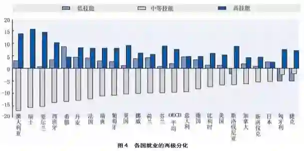 其次,可获得的工作种类在不断变化。由于普遍的线性思维倾向,进步的非连续性,以及无法预测的需求,预测新的职业总是困难的。有些人断言,有些工作消亡了,自动化正在彻底改变劳动力;另一些人则认为,很多工作被取代的同时,自动化也创造了同样多的工作。无论如何,今天世界各地的劳动者所能获得的工作种类,与20年前很不一样了(OECD,2017)。图4显示了1995-2215年间劳动者工作种类的变化。从该图看,工作的两极分化很明显。高技能工作(如管理和专业人员)和低技能工作(如服务和零售)的数量都有增加,但中等技能工作(如贸易、机器操作和装配)在消失。考虑到这一趋势,迫切需要帮助学生为复杂的内容领域建立坚实的基础,帮助他们应对一生中可能需要的技能提升。