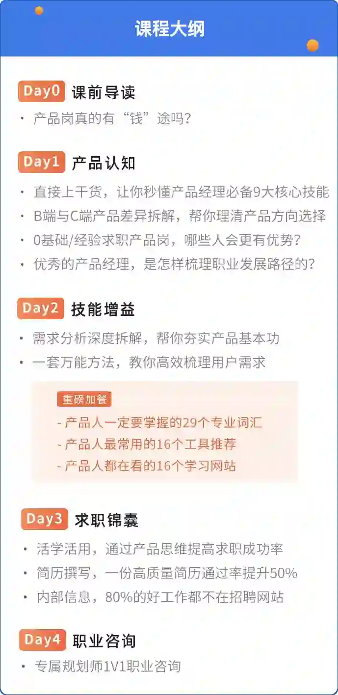 除了干货课程,整套学习还包括:4天社群服务+班主任督学答疑+1V1职业咨询服务,最重要的是,性价比超高!只需要 2.8 元!
