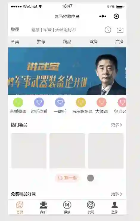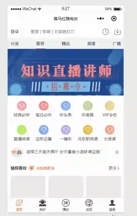 首先,前提,喜马拉雅电台是一个音频分享有声读物的app,由于微信小程序的限制2M,我们这个模块不可能太大,功能也不可能齐全,所以我们要适当的缩减部分功能--->>缩减功能。