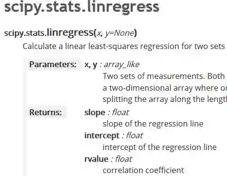 这是 Scipy 中的统计模块中的一个高度专门化的线性回归函数。其灵活性相当受限,因为它只对计算两组测量值的最小二乘回归进行优化。因此,你不能用它拟合一般的线性模型,或者是用它来进行多变量回归分析。但是,由于该函数的目的是为了执行专门的任务,所以当我们遇到简单的线性回归分析时,这是最快速的方法之一。除了已拟合的系数和截距项(intercept term)外,它还会返回基本的统计学值如 R² 系数与标准差。
