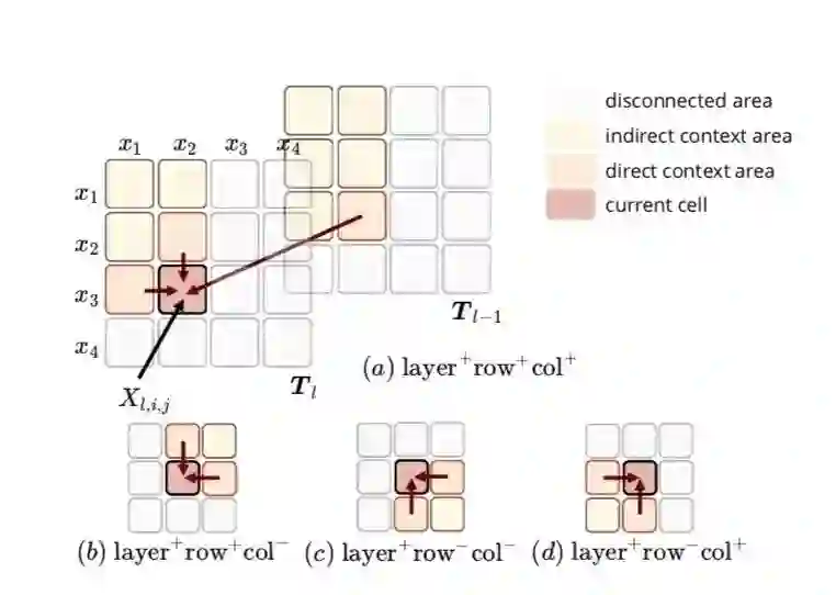 整个Table Encoder部分由多个Table Encoding的单元组成,每个Encoding单元的输入分别是起始输入 ,对应senquence结构的输入 ,以及上一个Tabel Encoding单元的输出 ,Table Encoding 采用MDRNN结构提取输入的特征信息,作者在这选择MDGRU(多维度GRU),tabel结构本身有2维,加上前后层实际有4维,但是层的维度信息单向流动,实际上是只用到了3个方向( )
