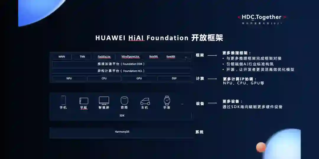 2017 年 9 月,华为发布了首款自带神经网络计算单元 NPU 的移动芯片麒麟 970。2018 年 3 月,HUAWEI HiAI Foundation 随之发布。经过几年发展,HUAWEI HiAI Foundation 已经从仅支持手机扩展到了全场景硬件,还可以做到一次开发多端运行。计算能力上看,则可以协同 NPU/CPU/GPU/DSP 实现异构计算,大幅提升了效率。