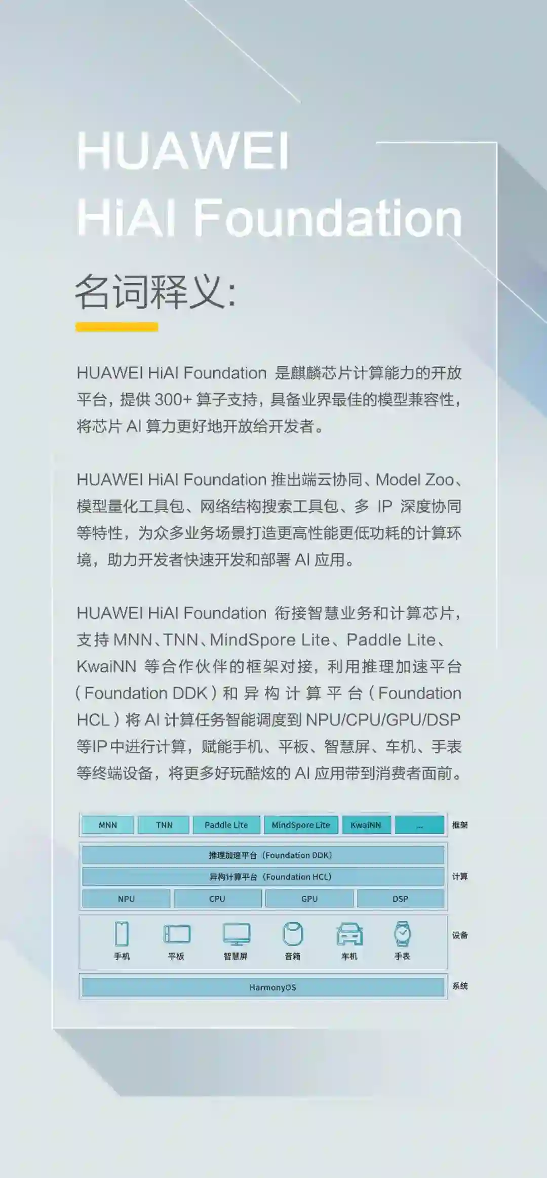 作为连接底层硬件算力和应用之间的桥梁,HUAWEI HiAI Foundation 目前支持超过 300 个通用算子,TensorFlow、PyTorch 等主流深度学习框架,国内开源深度学习平台,以及很多厂商的自用框架。硬件支持从麒麟 810 到麒麟 9000——内置华为自研 NPU 的所有芯片。