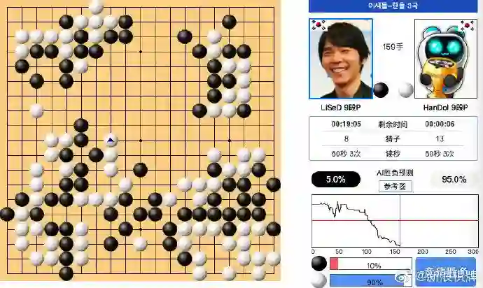 弈至 159 手,李世石胜率降到 5%。图源:新浪棋牌微博。
