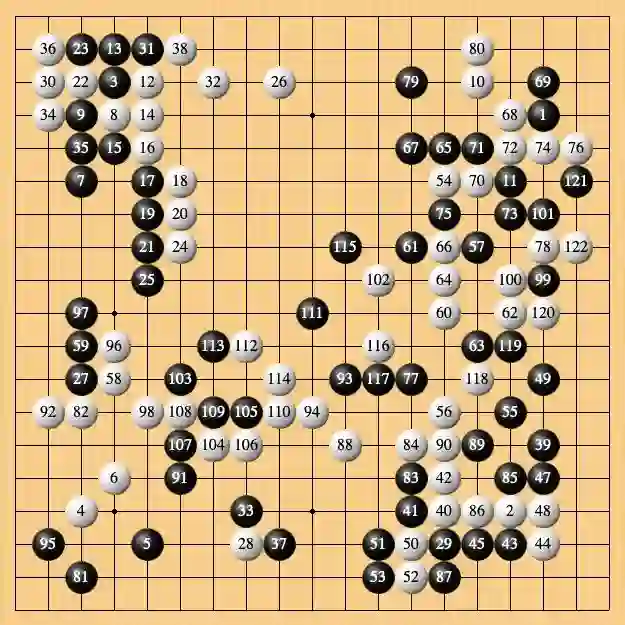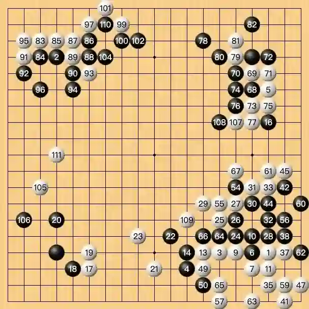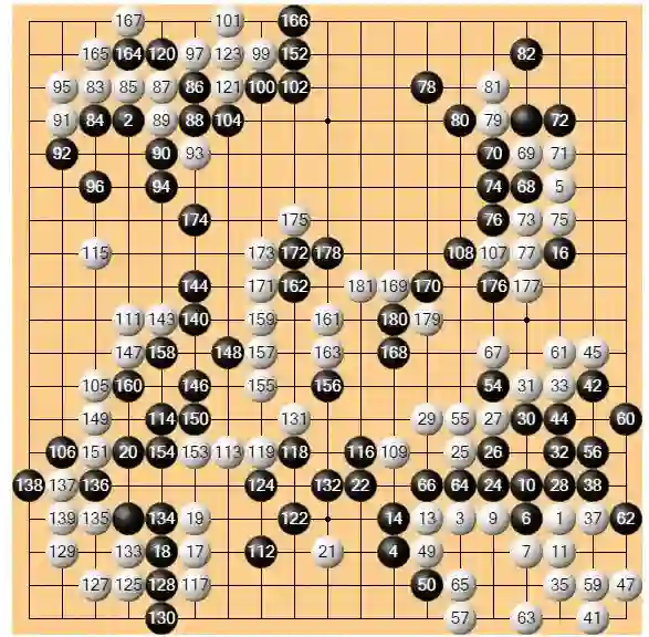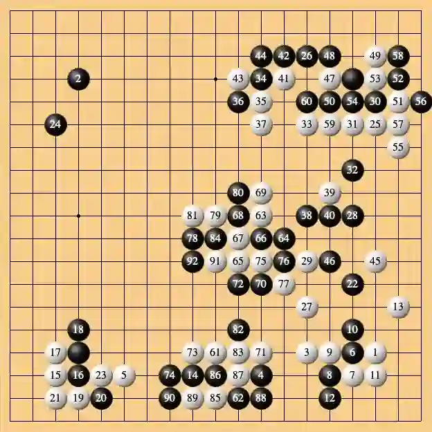 这一场李世石依然受两子执黑挑战 AI,黑棋贴目 7 目半。人类与 AI 在棋盘右下角展开激战。