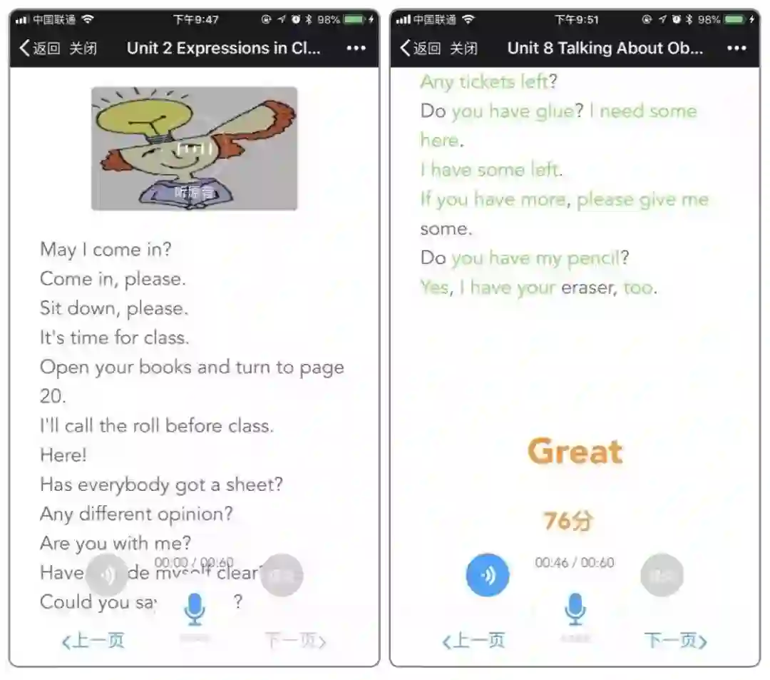《英语900句》非常强调大家的输出练习,每天学习过后都会有对应教材的、及时的跟读训练,已经人工智能的纠音评分系统,帮助你了解自己的发音问题。