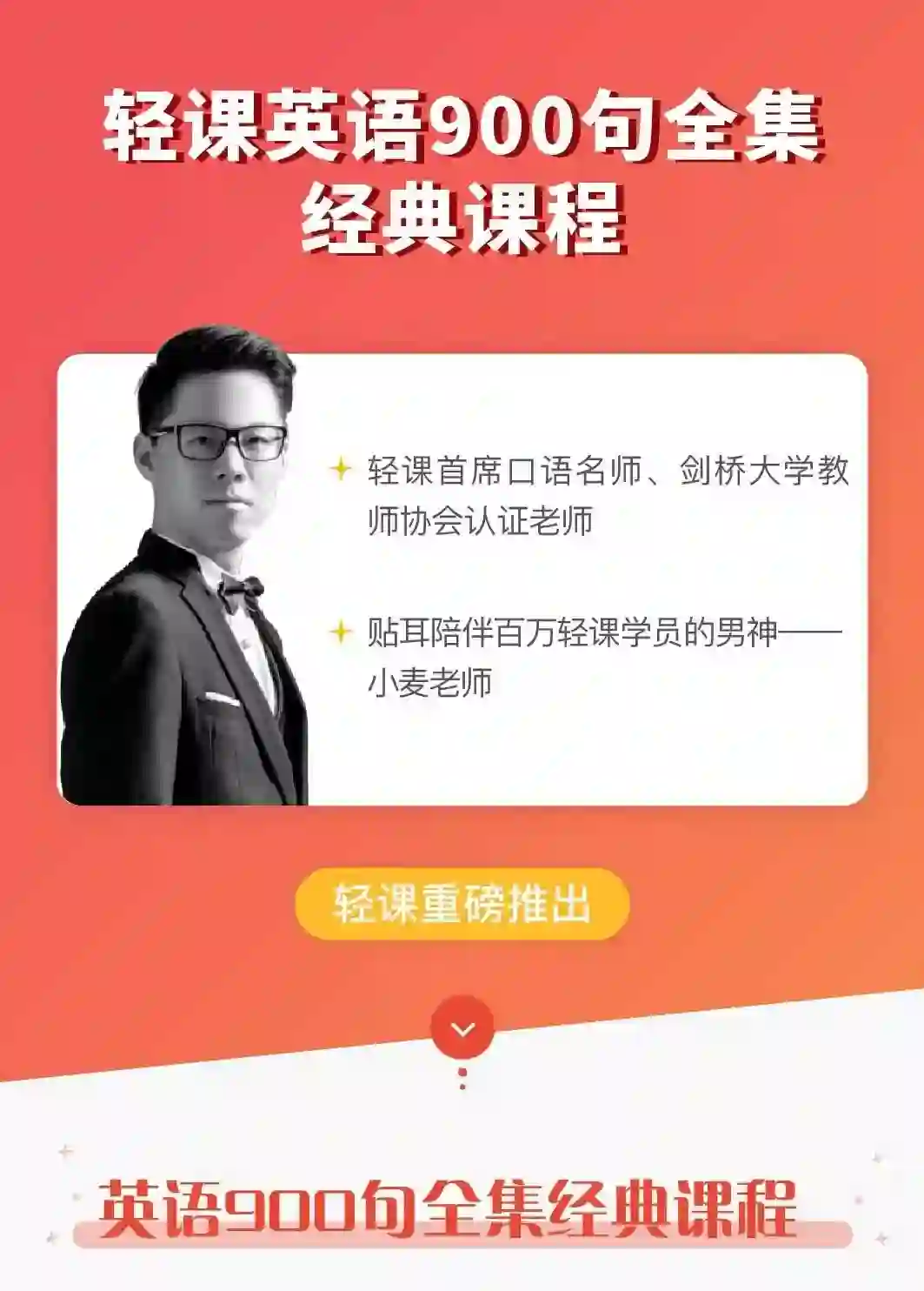 如今,拥有百万学员的小麦老师与专注于互联网英语教育的轻课,携手打造了一门免费的《英语900句》在线英语课程。