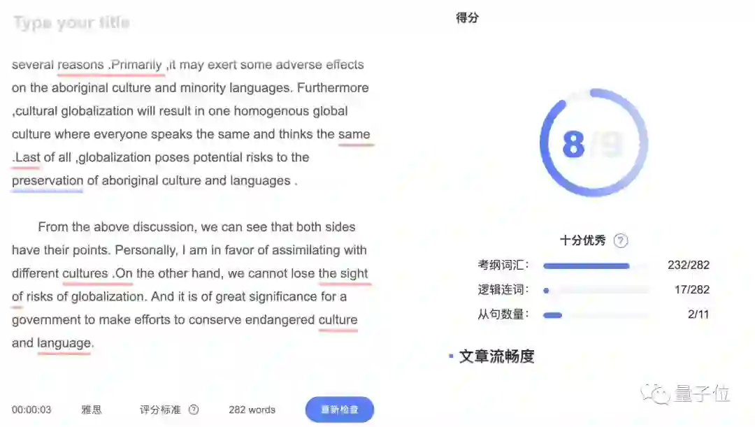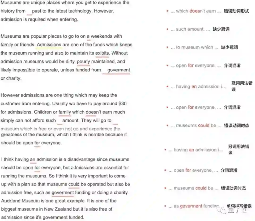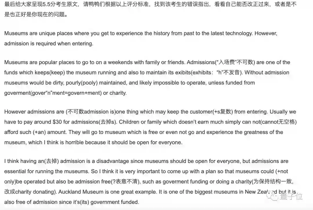量子位在网上找了一篇5.5的文章,粘了进去,点检查,很快批改就出来了,来比较一下跟老师手动改的是否一致。