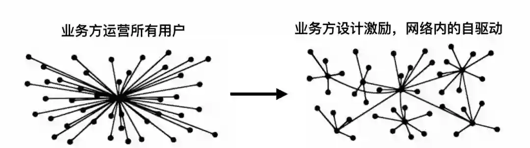 再进一步细想,这种模式和传统互联网获客逻辑有个 180 度的转变,传统模式先产品,再用户,用户是消费者,是受众。但是这种全新模式完全颠倒了过来,通过自增长营销网络先聚集用户,然后携用户落地业务,用户是网络建设主动参与者和受益方。