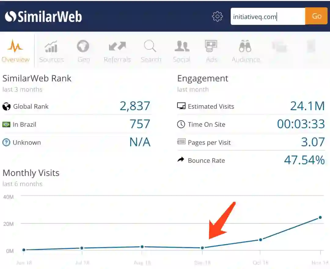 最近海外一个网站排名蹿升飞速 - initiativeq.com,特别是最近两个月的时间访问量暴涨至单月 2400 万的访问,达到了全球两千名的排名,可能这个数据对于很多从业人士不足为奇,但是!如果跟你说,这个产品都完全没有上线,就已经积累的几千万用户呢?