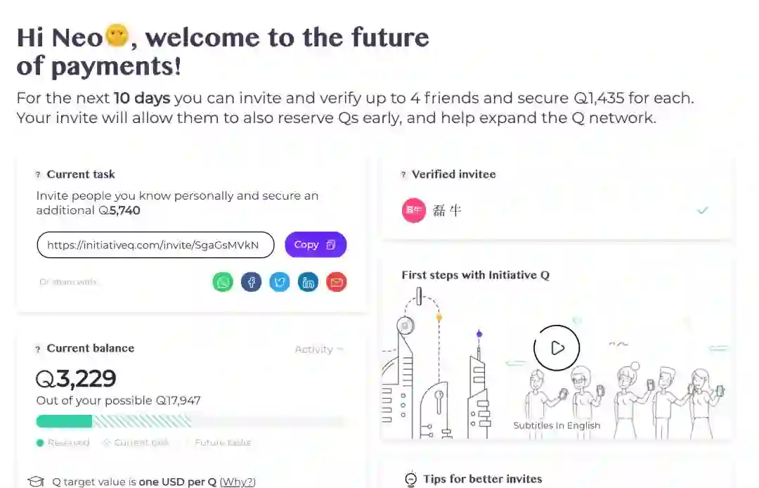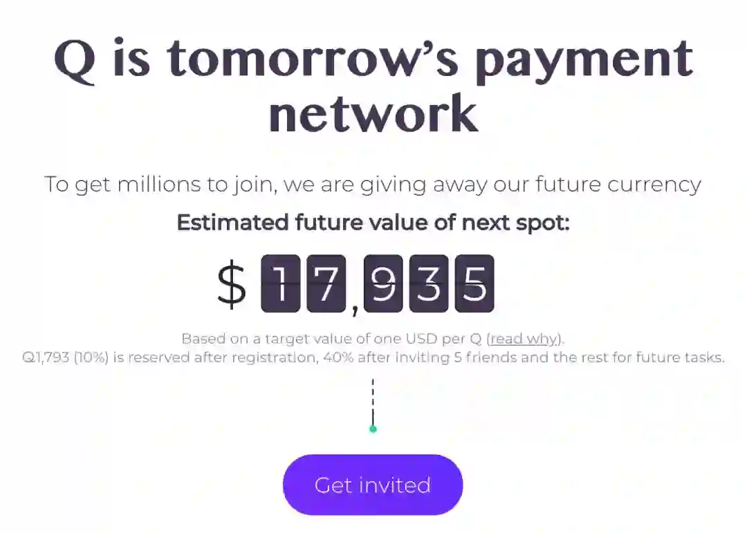 Initiative Q 给自己的定位是属于未来的全球化支付网络(注意不是区块链),为什么呢,因为未来因为 Q 的使用人群足够大,所以全球商户都会接入,为了达到这个目标,需要先邀请足够多的用户加入这个网络,系统会奖励参与邀请的早期用户一定的奖励,什么奖励呢——Q。那么 Q 的价值是多少呢?越多的人使用,Q 的价值就越大,在未来甚至会达到 1Q=1 美金,所以加入越早,获得的未来美金就越多。