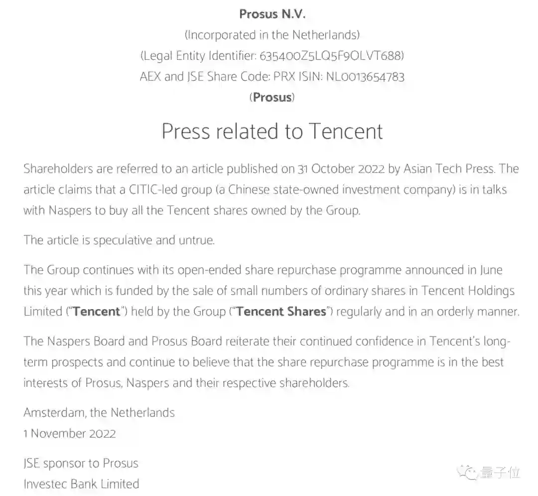 在声明中,Prosus表示:对腾讯的长期前景仍有信心。