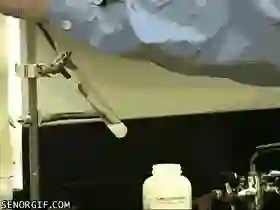 原理:这种液体是二乙基锌。它是一种极易燃烧的有机锌化合物,接触氧气便自燃。真正的二乙基锌如此图所示是蓝色火焰,但是网上流传最广的视频/动图来自2008年诺丁汉大学,他们拍到了黄色的火焰——照他们自己的说法,这是钠污染所致。