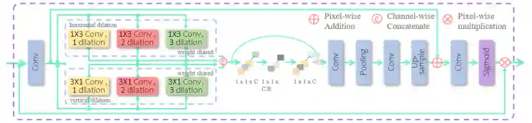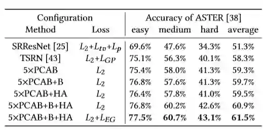 层次正交纹理感知模块(HOTA)借鉴自ContourNet [3]的LOTM模块,其设计初衷是用于捕获文本高频纹理特征用于进行精确地轮廓分割。我们将这种做法迁移到文本图像超分领域,同样分为垂直和水平方向上扩张卷积核的尺寸使得此层能够感知更多的高频轮廓信息,将其建模成通道空间注意力模块,能够隐式地增强文本轮廓的表达能力。如图1和图3所示,各级PCAB模块的输出被级联起来,作为HOTA模块的输入,因此它能综合网络不同层次的特征进行自注意力。HOTA模块也是一种双分支再特征聚合的结构,双分支分别以1xk和kx1聚合水平和垂直方向更大感受野的纹理信息,并为其添加上空洞系数,共享不同空洞系数的卷积层参数,使得其能够得到更加显著的效果。双分支特征通过一个通道注意力模块特征融合汇总以后,经过若干层卷积、残差、上采样处理,经过一层Sigmoid激活函数对每一特征值归一化,从而得到相应的注意力响应图。最后将注意力响应图与输入特征进行点乘,即可得到纹理感知增强过后的输出特征。