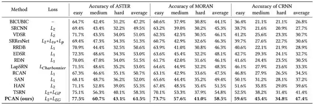我们在真实文本超分辨率数据集(TextZoom)上和七个主流场景文本识别数据集(CUTE80, IC03, IC13, IC15, IIIT5K, SVT, SVTP)上对我们的算法进行了评价。此项任务中,我们将以CRNN [6]、ASTER [7]、MORAN [5]的识别准确率作为评估超分辨率图像质量的标准,也提供PSNR/SSIM指标作为参考。