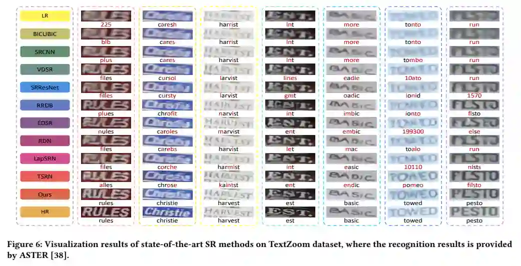 其次,如表3所示,与当前性能最优的各大通用超分网络以及文本超分网络进行性能对比。如图5所示,我们可视化了一些样例图。