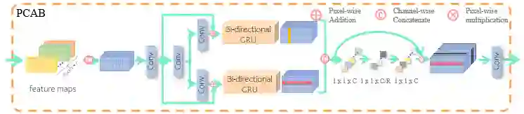 并行上下文注意力模块(PCAB)旨在寻求文本超分辨率块上更有效地上下文信息建模方法。经验上,我们发现一种双分支结构,并行地构建垂直和水平方向上视觉特征的依赖关系,能够得到比串行方式建模更好的结果。此外,利用通道注意力自适应加权以上特征,作为两种依赖信息的门控,可以进一步提高我们算法的性能(见实验1)。如图2所示,我们将卷积层得到(B,C,H,W)维度特征通过矩阵转置得到(B*H,W,C)维度的特征,GRU模块能够作用于(B,T,C)输入特征的T方向上,构建此维度特征的循环连接,最后将特征转换为原来的形状以便后续融合。公式描述如下: