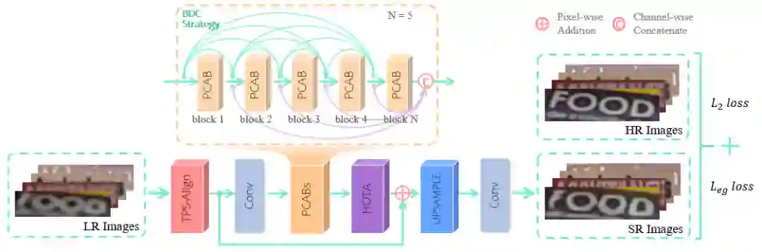 我们的网络结构基于TSRN [1],在此基础上我们提出了如下几个核心组件,分别是并行上下文注意力模块(PCAB)、层次正交纹理感知注意力模块(HOTA)和边缘引导的损失函数(