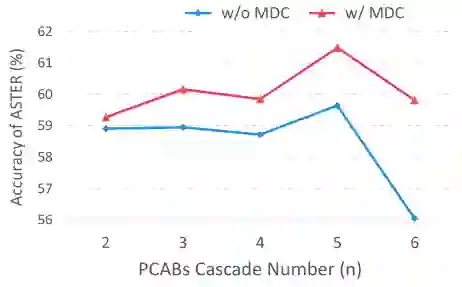 图 4 PCAB模块的连接方法、数量方面的性能差异。MDC表示模块间稠密连接