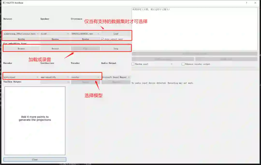 重要的数据处理操作是进行音频和梅尔频谱图预处理:python pre.py <datasets_root> 可以传入参数 --dataset {dataset} 支持 aidatatang_200zh, magicdata, aishell3