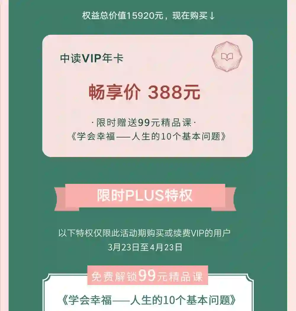 3月23日至4月23日期间,购买/续费中读VIP年卡即可免费领取课程,课程领取后永久有效。