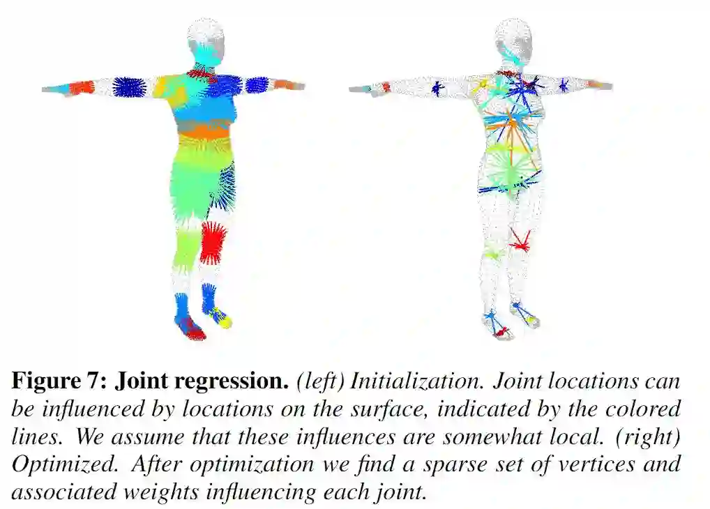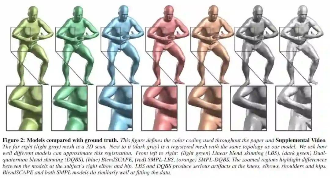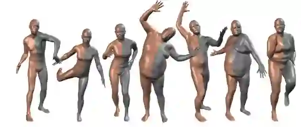提出了一种新的人体形状和位置相关形状变化的学习模型,该模型比以前的模型更精确,并且与现有的图形管道兼容。蒙皮多人线性模型(SMPL)是一种基于蒙皮顶点的模型,它可以准确地表示人体自然姿态中的各种体型。模型的参数从数据中学习,包括rest位姿模板、混合权重、位置相关混合形状、身份相关混合形状和从顶点到关节位置的回归器。与以往的模型不同,与位置相关的混合形状是位姿旋转矩阵元素的线性函数。这个简单的公式使训练整个模型从一个相对较大的不同的人在不同的姿势对齐的3D网格。使用线性或双四元数混合皮肤定量评估SMPL的变体,并表明两者都比基于相同数据的BlendSCAPE模型更准确。还将SMPL扩展到动态软组织变形的真实模型中。因为它是基于混合皮肤的,所以SMPL与现有的渲染引擎兼容,可以将其用于研究目的。