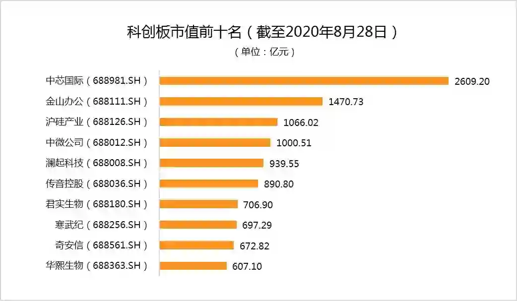 本周科创板上市公司市值前十的公司中,中芯国际(688981.SH)摘得桂冠;其后为金山办公(688111.SH)、沪硅产业(688126.SH)、中微公司(688012.SH)以及澜起科技(688008.SH)等。