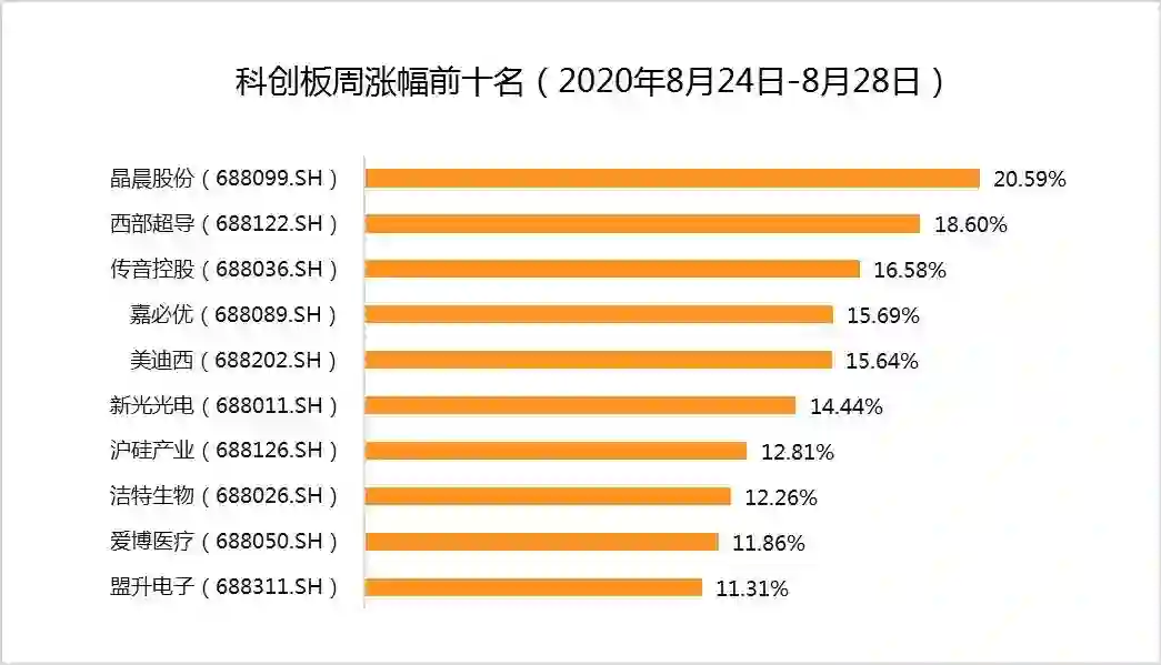 一周涨幅榜上晶晨股份(688099.SH)、西部超导(688122.SH)、传音控股(688036.SH)名列前三。