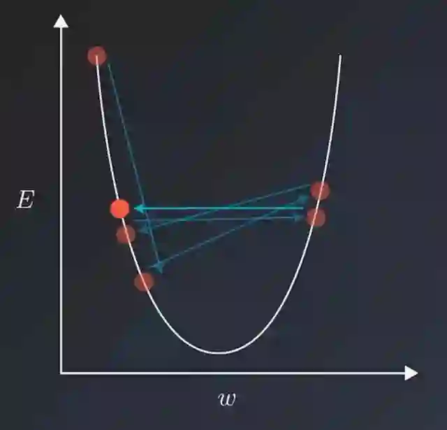 如果让人来走,可能就不一样了,你可能会先随便选一个方向,然后沿着这个方向的梯度向下走;过一会儿再随机换一个方向向下走;最后你发现自己差不多也到了谷底了。