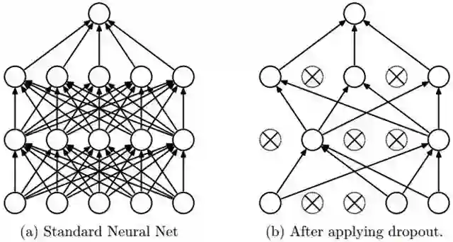 Dropout 可以很好地解决这个问题。Dropout说的简单一点就是在前向传导的时候,让某个神经元的激活值以一定的概率p停止工作,示意图如下: