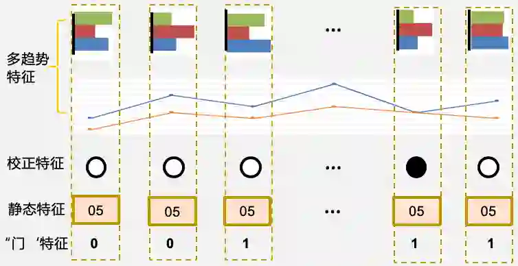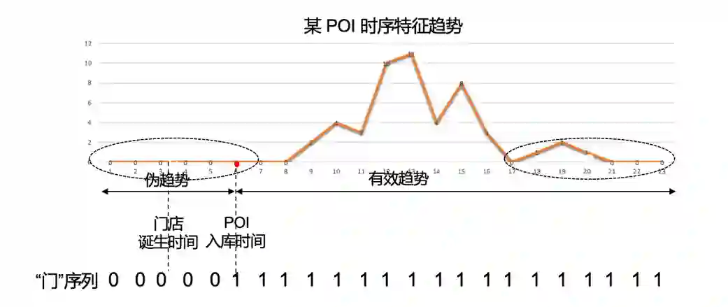 对比采用第二种方案效果更优。考虑到我们只有 POI 的入库创建时间信息,而不了解门店的具体诞生时间,直接按入库时间截取序列,会造成门店诞生和 POI 创建时间段内的特征信息损失;而添加"门"序列则可以在保持信息完备的同时约束高可信区间。最后构建的混合特征示意图如下所示。